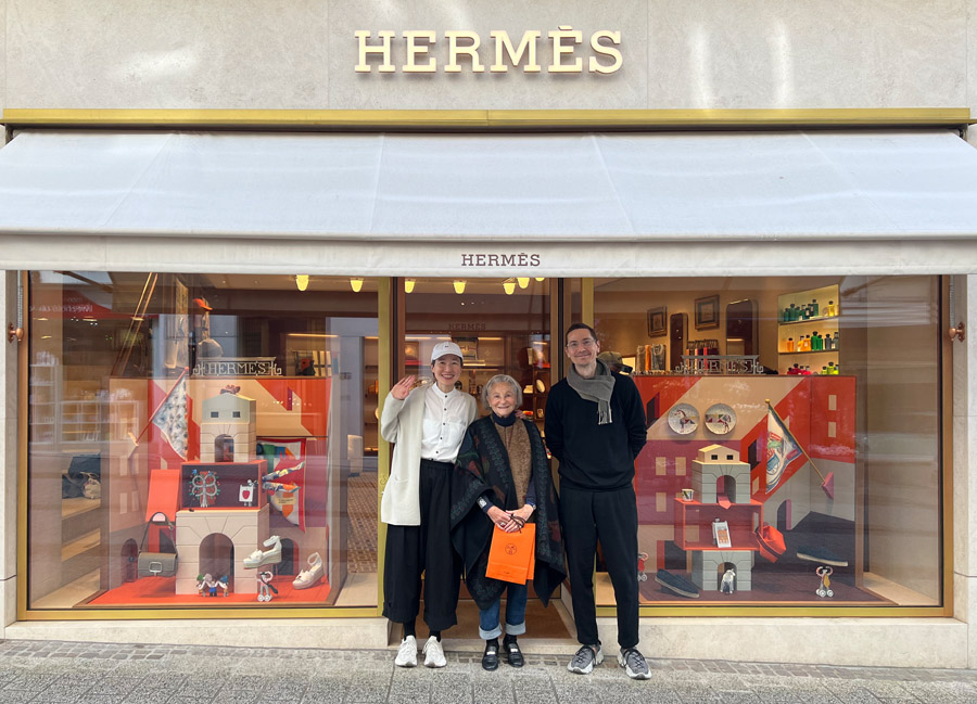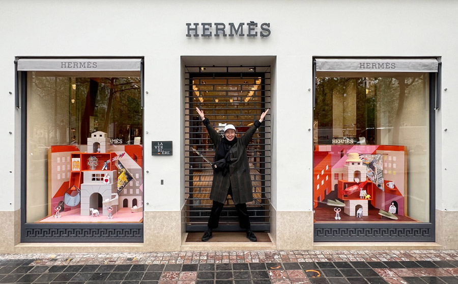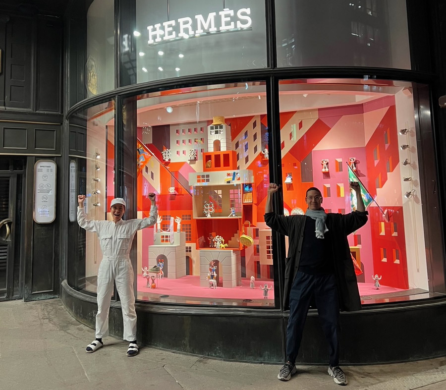 Hermès Brussels windows done! Happy Aamu posing with Fauborg Spirits.