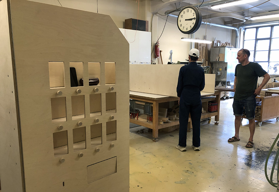 Vending machines! Woodworking with great Mikko M. These all fold into a flat pack and travel to Japan for our touring exhibiton starting September 20th at Artek Store Tokyo.